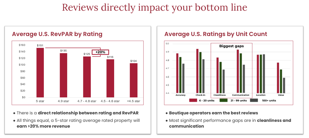We actually looked into this ourselves because we were curious. We did an analysis of every short-term rental in the U.S. and correlated review ratings with the number of properties each manager oversaw. If you look at the graph on the right below, you’ll see a clear trend: as the number of properties increases, ratings start to decline. This is important because the left chart shows the correlation between reviews and revenue. Even just moving from a 4.7 – 4.8 to a 5.0 can help a property earn 20% more revenue.