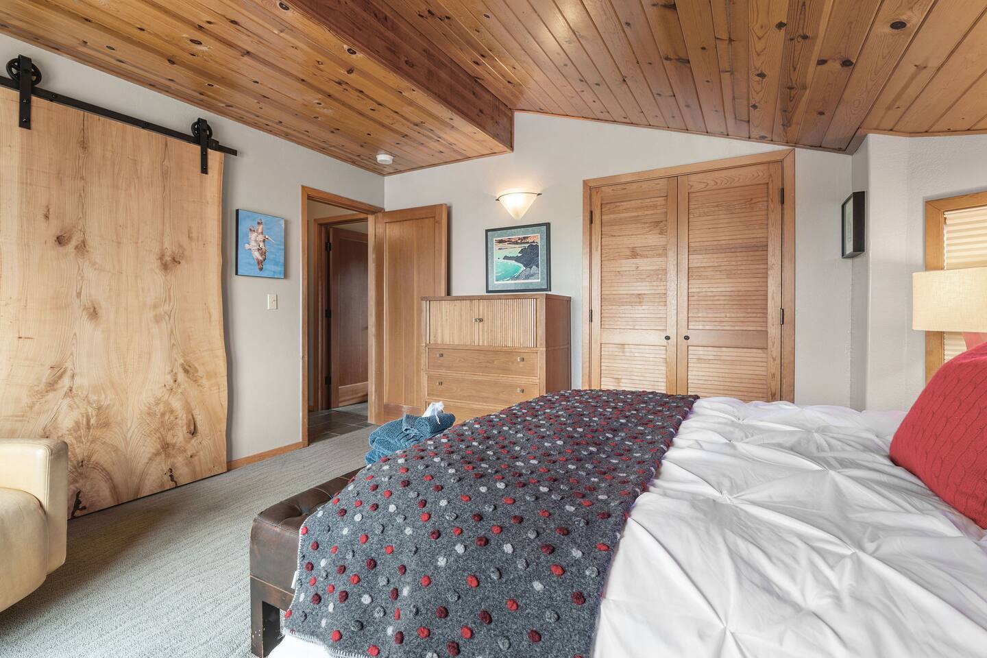 The second bedroom offers a cozy queen bed, while the downstairs king bedroom and twin room provide comfort and privacy, with serene views of the surrounding landscape. The upstairs suite feels like a private observatory, with floor-to-ceiling views and direct access to the deck for sunset wind-downs.
