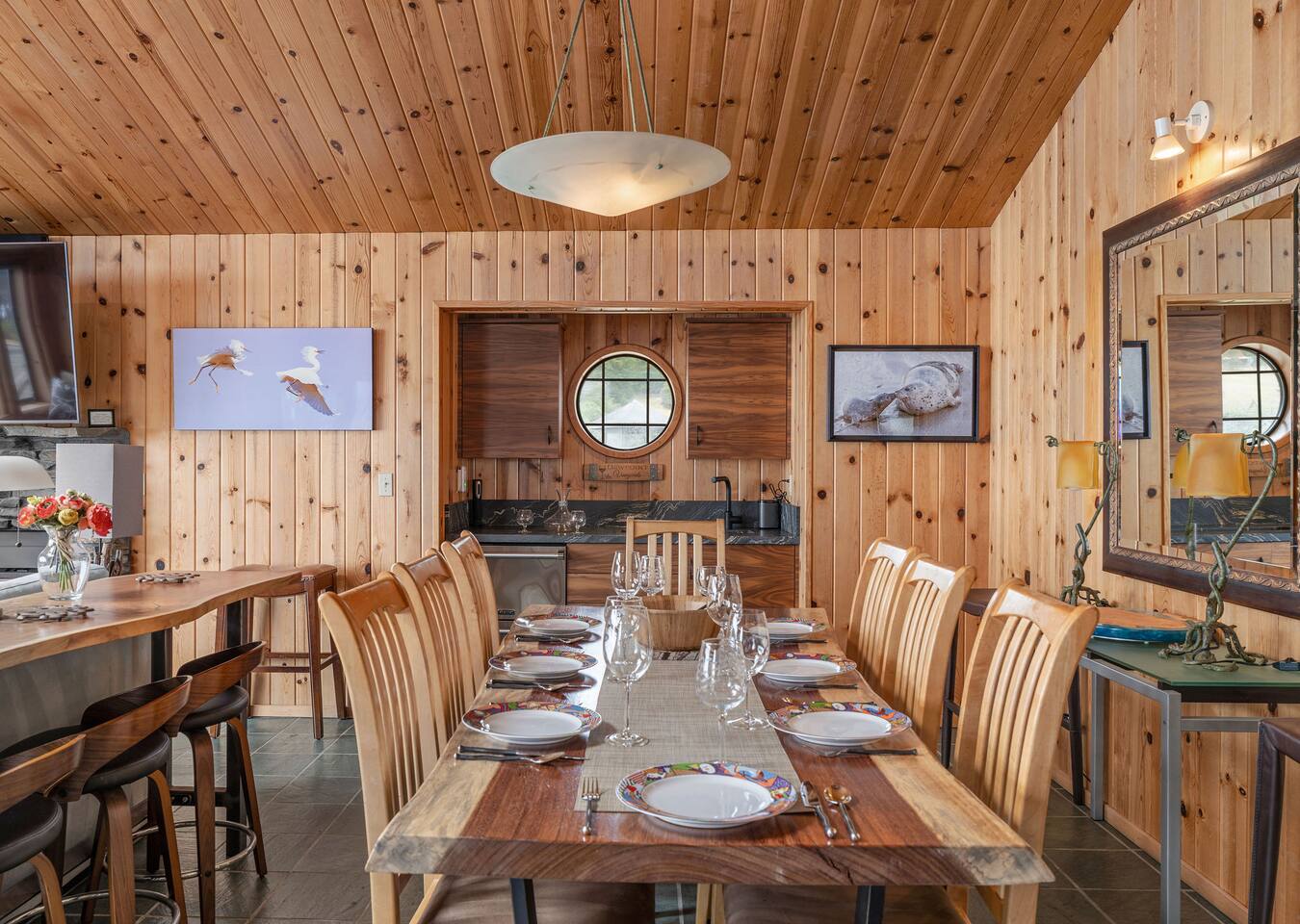 Further in, the fully equipped kitchen makes cooking a joy, with modern appliances and all the tools you need to create a seafood feast or a simple breakfast spread. The adjacent dining area is ideal for low, scenic meals as nature plays your soundtrack.