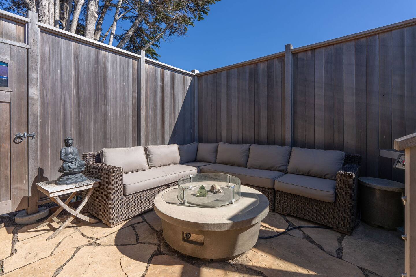 The home is surrounded by serene outdoor spaces designed for pure relaxation. Gaze out over the expansive ocean or up at the starry night sky while staying warm beside one of the firepits. Fire up the grill and gather with loved ones for a BBQ in the lower patio, because nothing pairs better with the ocean breeze than a savory meal shared outdoors.